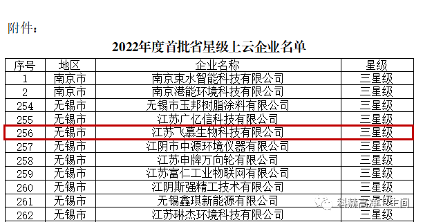 关注我们江苏飞慕生物科技有限公司荣获江苏省工信厅2022年度首批星级上云(三星级)企业认定工业互联网2022 首批次 /星级上云企业名单
